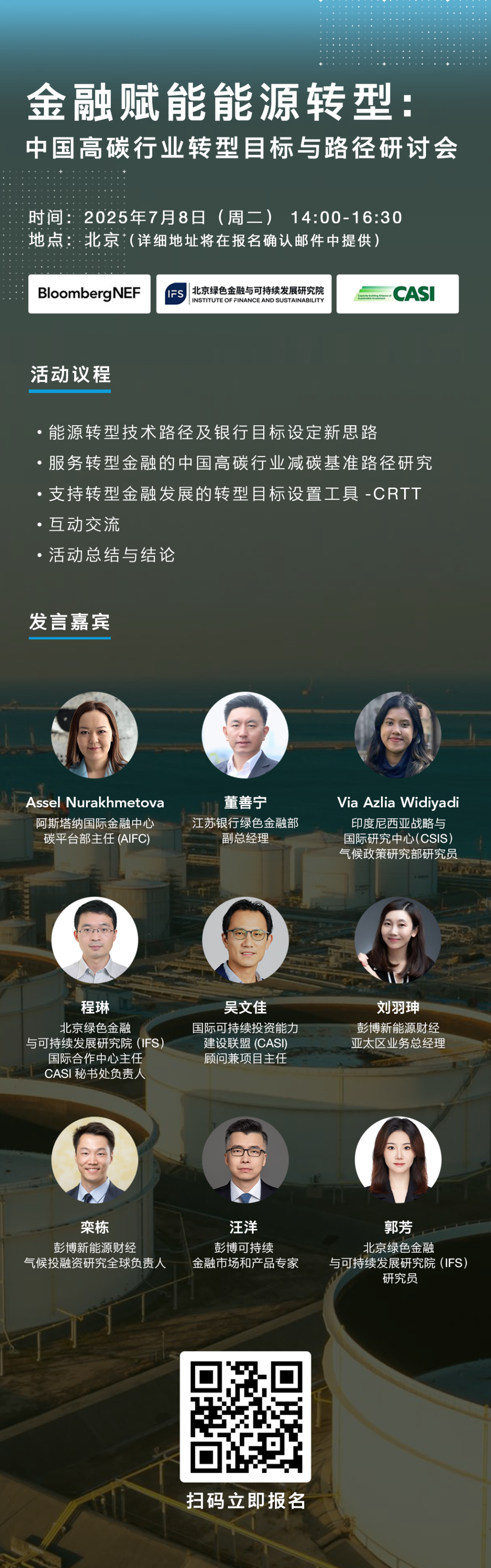 2025年7月8日,周二下午BNEF, IFS, CASI 联合主办的线下闭门研讨会旨在汇聚行业领袖、金融机构与专家学者,共同探讨如何深化解决上述议题,推动构建高效、可落地的转型金融机制,为高碳行业的绿色低碳转型提供有力支持。