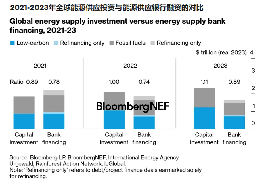 能源行业正在将更多的投资转向更清洁的供应来源。2023年,银行对低碳能源供应技术的融资达到对化石燃料融资的89%——这意味着,每投入1美元用于石油、天然气和煤炭,就有89美分投资于风电、光伏和电网等。本报告是彭博新能源财经关于能源供应融资的第三份年度报告,分析了能源企业的投资和银行促成的融资。尽管有所改善,但2030年能源供应投资比值需要至少达到4:1,这一增速无法达到这一水平。这一目标是由普遍参考的全球温升幅度限制在1.5摄氏度以内的气候情景所得出的。