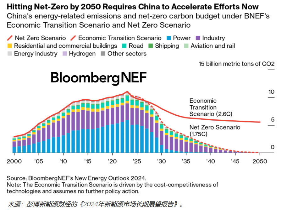 《2024年新能源市场长期展望:中国》 ]article_adlist-->中国已经是世界上最大的能源转型投资国,目标是到2060年实现碳中和。但这个目标仍有提升空间,以实现《巴黎协定》中将全球温升控制在远低于2摄氏度的目标。要想比原计划提前十年实现净零排放,中国现在就需要加速减排,尤其是在脱碳难度更大的领域推广尚不具备商业竞争力的技术。 根据彭博新能源财经的模型,要实现2050年达到净零排放,需要累计超过46万亿美元的投资。要使中国的排放曲线朝着2050年实现净零的方向发展,各行各业的排放量如果还没有达峰的话需要立即下降。根据彭博新能源财经的净零情景,中国最大排放源电力行业的排放量去年已经达峰,而交通运输行业的排放量则在今年之后开始下降。